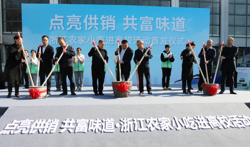 与会领导嘉宾以捣麻糍的方式共同开启了点亮供销·浙江农家小吃进高校系列活动启动仪式。