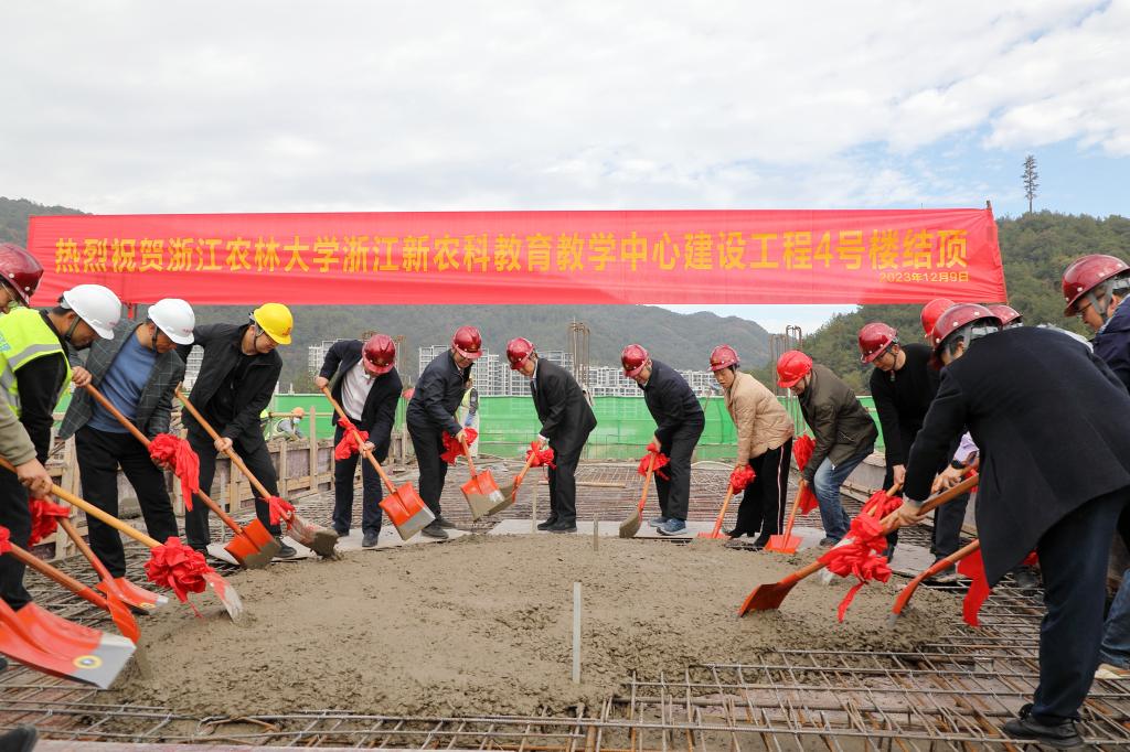 校党委书记朱斌,校长沈希,校党委副书记施美红,副校长胡祖吉、徐爱俊,出席结顶仪式。工程设计单位、施工单位、监理单位、跟踪审计单位代表和学校新农科建设领导小组全体成员参加了仪式。