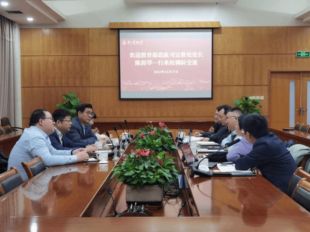 12月17日下午,教育部思政司宣教处处长陈郭华一行来校调研交流智慧思政工作。浙江省教育厅宣传统战处处长陈雷、教育部思政司宣教处副处长倪阳等人参加调研。校党委书记朱斌,党委副书记施美红,党委委员、宣传部长倪建均,学工部、研工部相关负责人陪同调研。