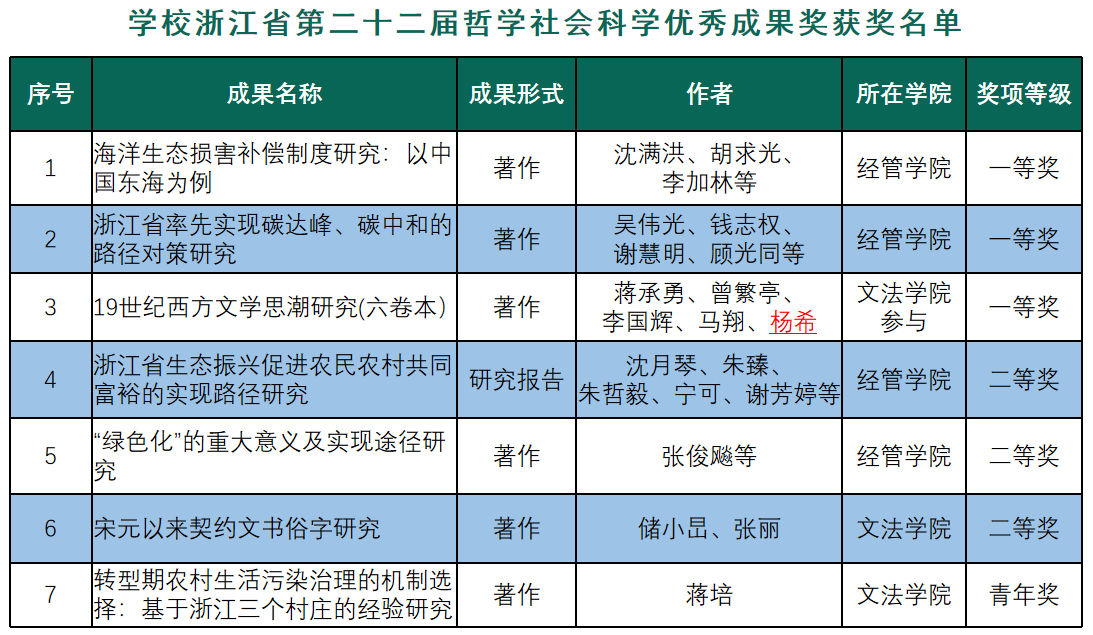 浙江省哲学社会科学优秀成果奖是由浙江省政府颁发的浙江省哲学社会科学研究最高奖,该奖项每两年一届。第二十二届哲学社会科学优秀成果奖获奖成果共299项,其中一等奖60项,二等奖179项,青年奖60项。