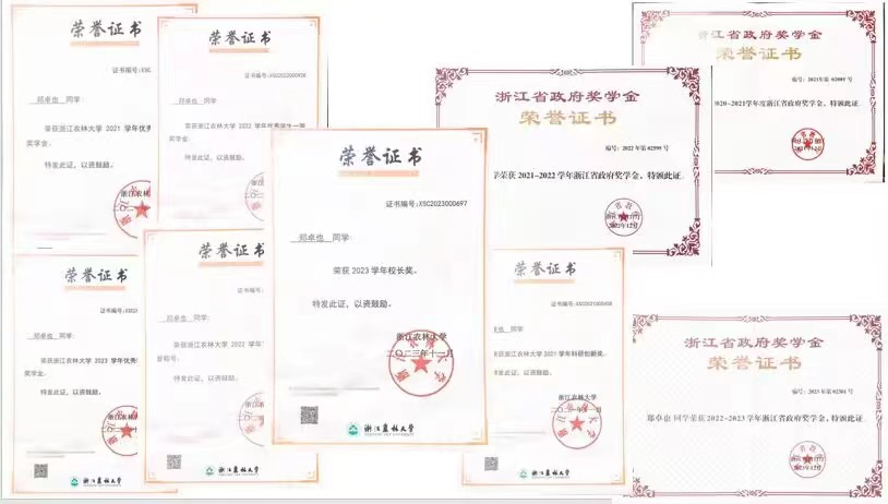 郑卓也,动科动医学院动物科学专业201班学生,BEAT365英国官网2023年本科生校长奖获得者。他品学兼优,多次获得校一、二等奖学金,三次获得省政府奖学金,曾获2021年校三好学生荣誉称号,入选浙江省新苗人才计划;他求实上进,积极参加竞赛,获全国大学生生命科学竞赛国家一等奖,国际大学生数学建模竞赛国家二等奖、中国大学生数模竞赛省二等奖。此外,他还曾获挑战杯省二等奖、东湖杯校一等奖、统计调查大赛校二等奖、2020年科研创新奖等多项奖项。