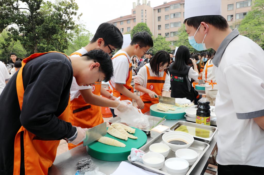 此次农林“笋”宴给师生们带来了一场全方位的饕餮盛宴。“农林第一锅”以春夏秋冬四季为意,分别用春笋为食材的“农林探春”、毛笋干为食材的“林花满夏”、小笋为食材的“大营猎秋”,冬笋为食材的“学海钓冬”四种笋味组成,呈现出笋的四时之味;以吴越十三州命名的特色佳肴各具历史韵味,充分体现临安吴越文化的千年积淀;厨艺大赛热闹非凡,专业厨师和师生选手摩拳擦掌,起锅烧油“火”出农林“笋”宴新热度。