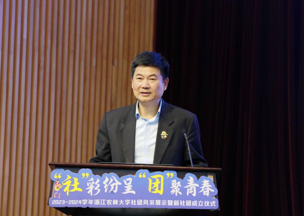 他对同学们提出三点希望。一是希望同学们在社团里彰显爱好、深耕兴趣,能主动走出寝室、走下网络、走进操场、走上舞台,参加一个社团、坚持一项运动、接触一份才艺,在体育运动中强健体魄、愉悦身心,在艺术熏陶中丰富思想、提高修养,感悟“体艺育人,终身受益”的价值所在。二是希望同学们在社团里培养能力、全面提升,能在社团中大胆施展才能,尽情绽放,锻炼团队协作能力,提升沟通交流技巧,增强解决问题的能力,实现个人素养的全方位提升,更好地彰显自我,照亮他人。三是希望同学们在社团里彼此欣赏、互相成就,能在社团这个大家庭中相互欣赏、相互尊重,在相互学习、相互激励中共同成长,实现“你中有我,我中有你”的精神交融,做到“彼此欣赏,互相成就”。