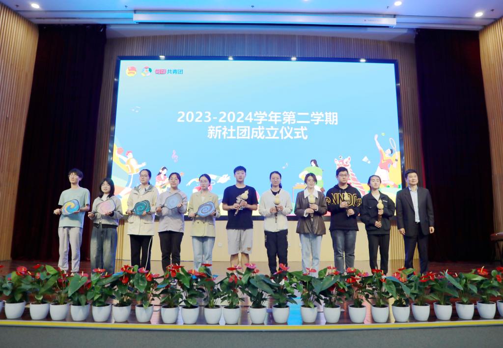 现场举行了2023-2024学年新社团成立仪式。沈希为新成立的丝韵葫芦丝社团、匹克球社团送上葫芦丝、匹克球拍。施美红为新成立社团指导老师颁发聘书。