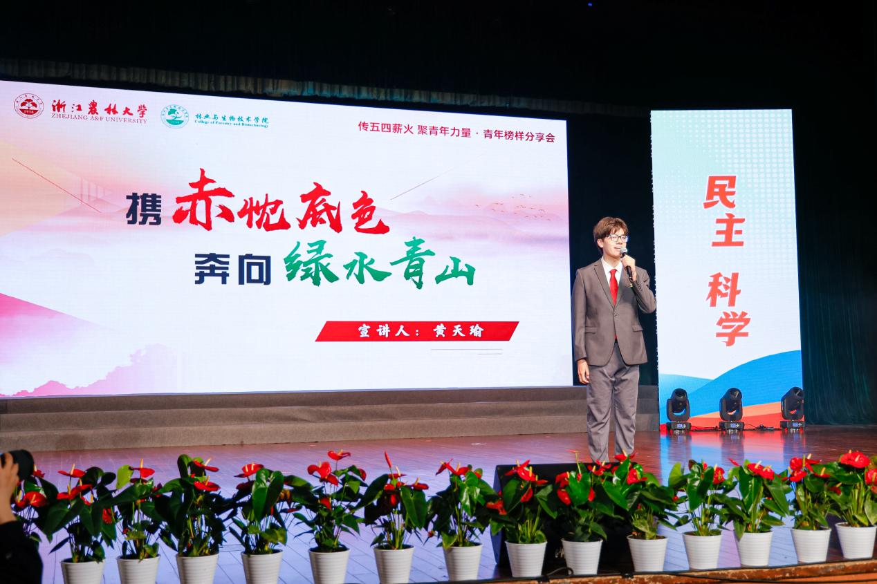 第十三届全国梁希优秀学子奖、校第八届红绿标兵提名奖获得者黄天瑜同学,第十八届“挑战杯”全国大学生课外学术科技作品竞赛黑科技专项赛特等奖获得者潘心怡同学,考取复旦大学药学专业硕士的王腾斐同学,2021年中国大学生自强之星获得者赵吟吟同学,中国大学生游泳锦标赛女子甲组200仰泳第三名获得者李静毓同学,浙江省大学生艺术节民乐合奏二等奖获得者苏菲雨同学,退伍于武警江苏总队无锡支队的傅俊儒同学,校雷锋班班长、被推荐2022年“万朵鲜花送雷锋活动”身边的活雷锋吉彦霖同学,全国大学生暑期社会实践“千校千项”优秀项目负责人、浙江省暑期社会实践调研报告一等奖获得者李建勋同学,杭州亚运会火炬传递丽水站第165棒火炬手、杭州亚运会亚残运会浙江省先进个人吴素青同学10名青年榜样代表分享了青春成长故事。