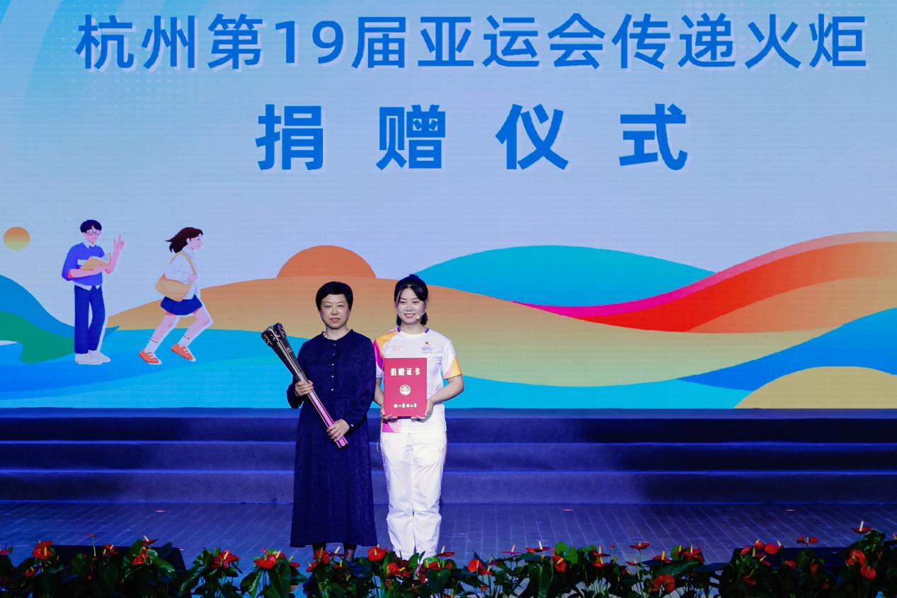 活动现场举行了杭州第19届亚运会火炬捐赠仪式。杭州亚运会火炬传递丽水站第165棒火炬手、BEAT365城乡规划专业2020级学生吴素青捐赠亚运火炬。校党委副书记施美红代表学校接受捐赠,并为吴素青颁发捐赠证书。
