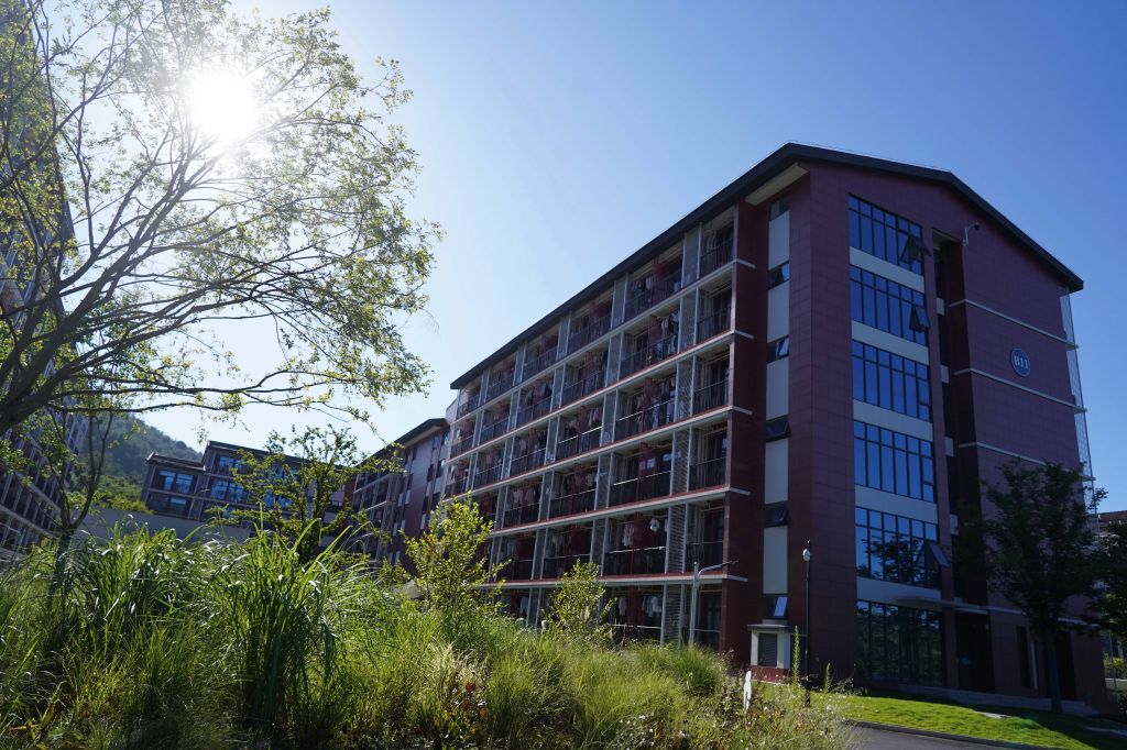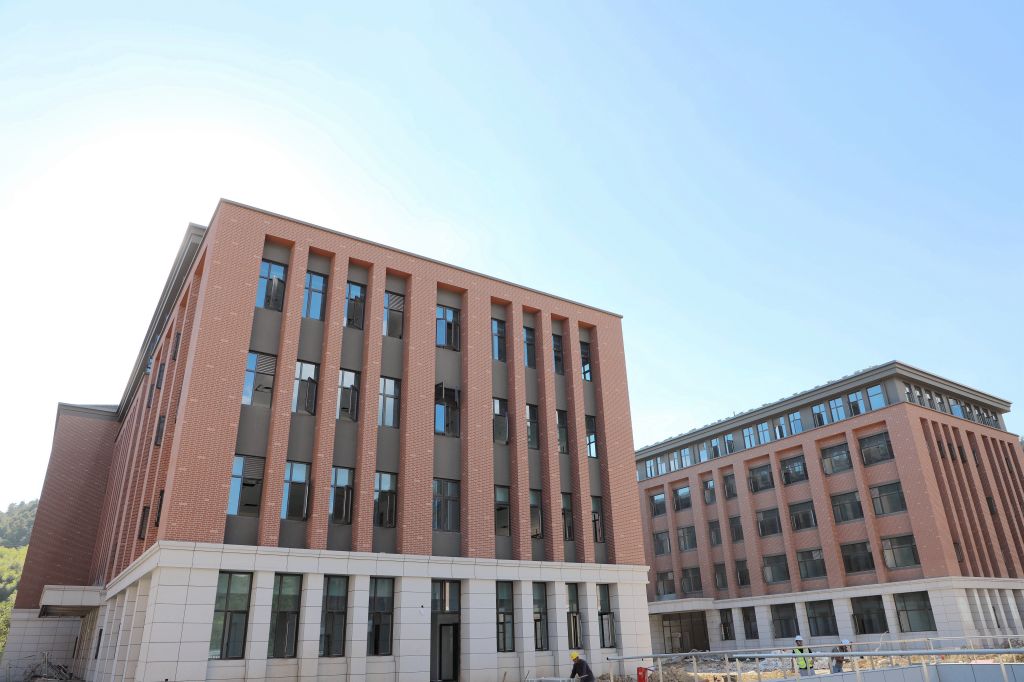 红墙褐顶的新农科大楼在蓝天白云的映衬下,
