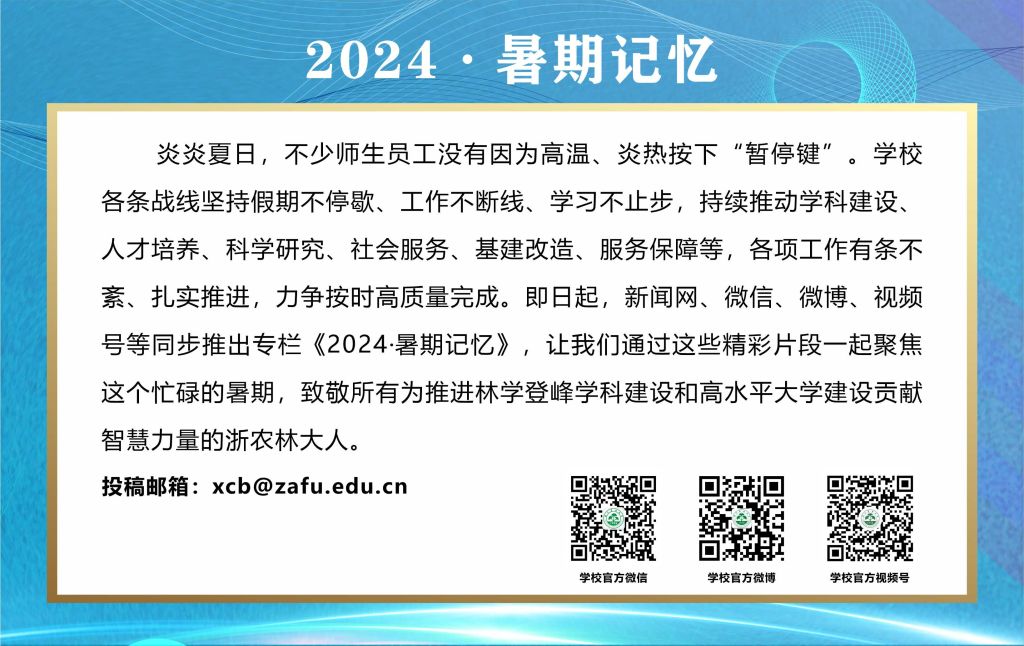 时无重至,华不再阳。浙农林大学子们都在抓住宝贵的暑期,珍惜每分每秒,为了自身科研创新目标与时间赛跑。他们在炎炎夏日的蝉声中,为青春的篇章添上一抹生机勃勃的绿意,写下充满希望的伏笔。