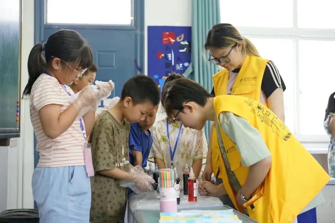 在杭州市临安区,艺术设计学院“艺术+”彩虹课堂暑期实践团队的成员们走进湍口镇小学,播种着艺术的种子。彩虹课堂由古贯今,着眼未来,从非遗扎染到古韵图腾,从布艺手工到嘹亮红歌,从粘土餐盘到数字博物馆,浙农林大学子引领孩子们热爱优秀传统文化,树立保护生态、面向未来的意识,从多个角度感受美、发现美、创造美,让孩子们在轻松愉快的氛围中体验艺术的魅力。孩子们既学习到了红色知识,又加深了爱国热情,实现了美育和思政教育的完美融合,提升了乡村儿童美育育人的实效。