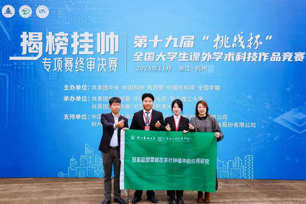 化材学院季馨雨等同学的项目《奇碱异能-复方甜菜碱植物生长营养剂的开发及其在柑橘、葡萄种植中的应用》获擂主。化材学院叶柔汐等同学的项目《甘氨酸甜菜碱在茶叶种植中的应用研究》、竹研院毕双博等同学的项目《“碳”索创新 “竹”梦未来—“双C”技术协同增效竹林碳汇》、竹研院王恩福等同学的项目《“竹”梦净化-竹炭增效空气净化器》获特等奖。