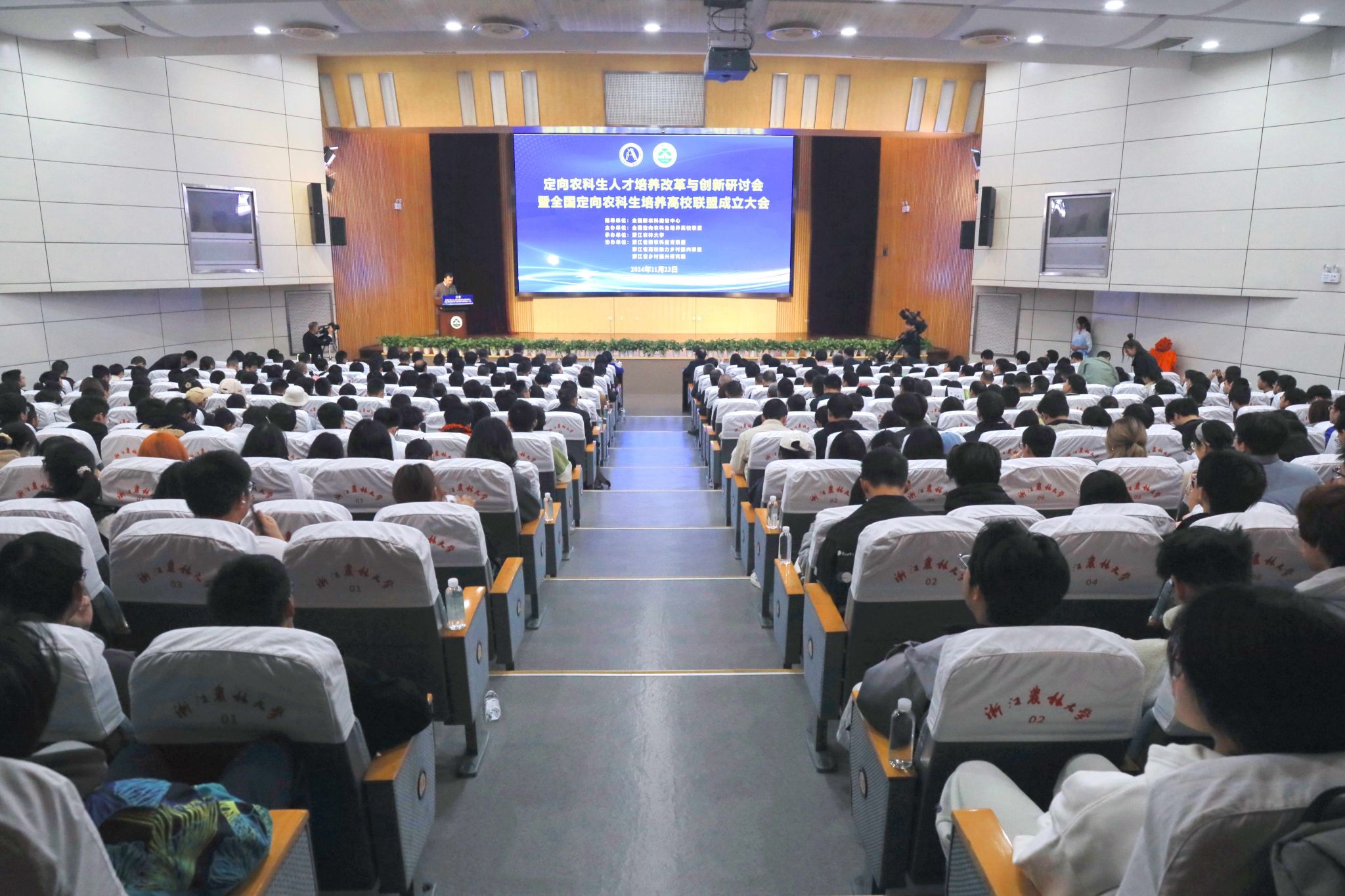 国务院参事、中国农业大学特聘教授何秀荣,农业农村部科学技术司教育与科技人才处处长连庆,全国新农科建设中心副秘书长金帷,浙江省教育厅高等教育处二级调研员王国银,浙江省农业农村厅科技教育处二级调研员倪英,浙江省粮食物资局人事处处长蒋新峰,浙江省林业局人事处副处长杨辉,山西农业大学副校长李步高,山东农业大学副校长周玉玺,丽水职业技术学院副院长汤书福,以及来自全国9所定向生培养高校的领导和师生代表400余人参加会议。BEAT365副校长沈月琴,校党委委员、动科动医学院院长宋厚辉出席会议。BEAT365党委副书记倪建均主持成立大会。