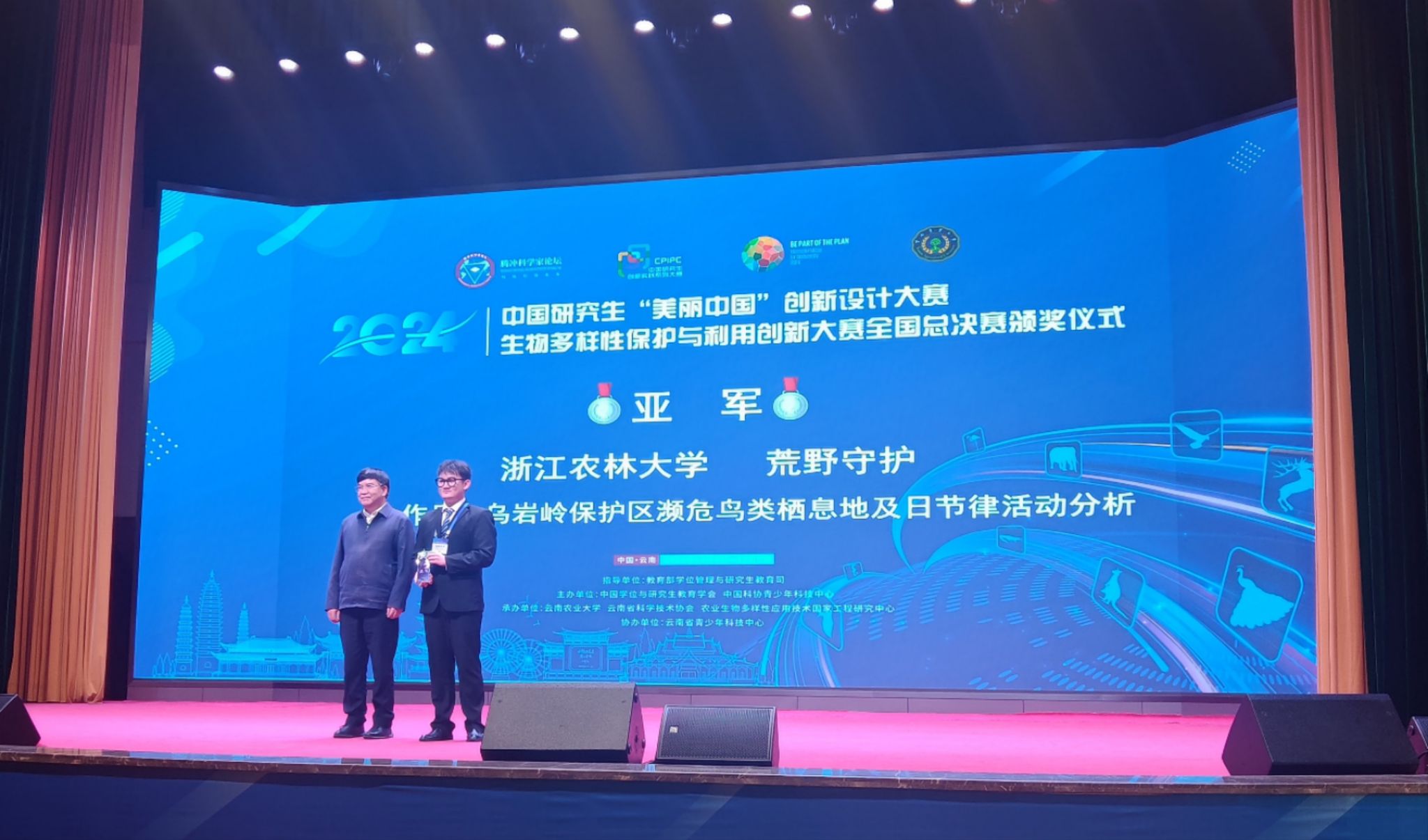12月6日—7日,中国研究生“美丽中国”创新设计大赛——生物多样性保护与利用创新大赛全国总决赛在云南昆明举行。经过多轮专家评审、总决赛现场答辩等环节,由动科动医学院选送的《乌岩岭保护区濒危鸟类栖息地及日节律活动分析》项目,从84家培养单位的328件作品中脱颖而出,获得亚军和一等奖,指导老师何珂和王芷筠荣获“优秀指导老师”荣誉称号。