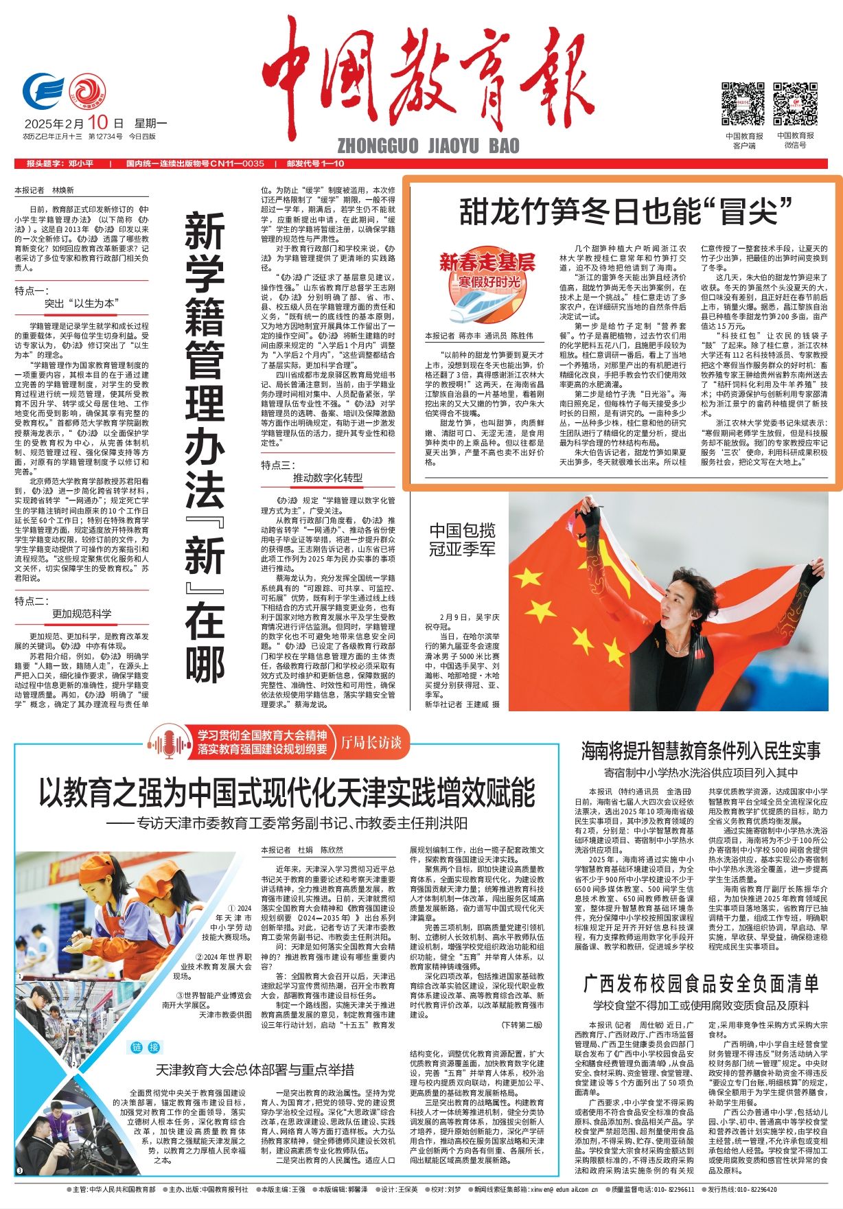 2月10日,《中国教育报》头版以《甜龙竹笋冬日也能“冒尖”》为题,报道BEAT365科技特派员深入海南省昌江黎族自治县,利用科研成果帮助农户提高竹笋产量,点赞科技特派员们利用寒假服务“三农”、服务社会,助力农民的钱袋子“鼓”起来。