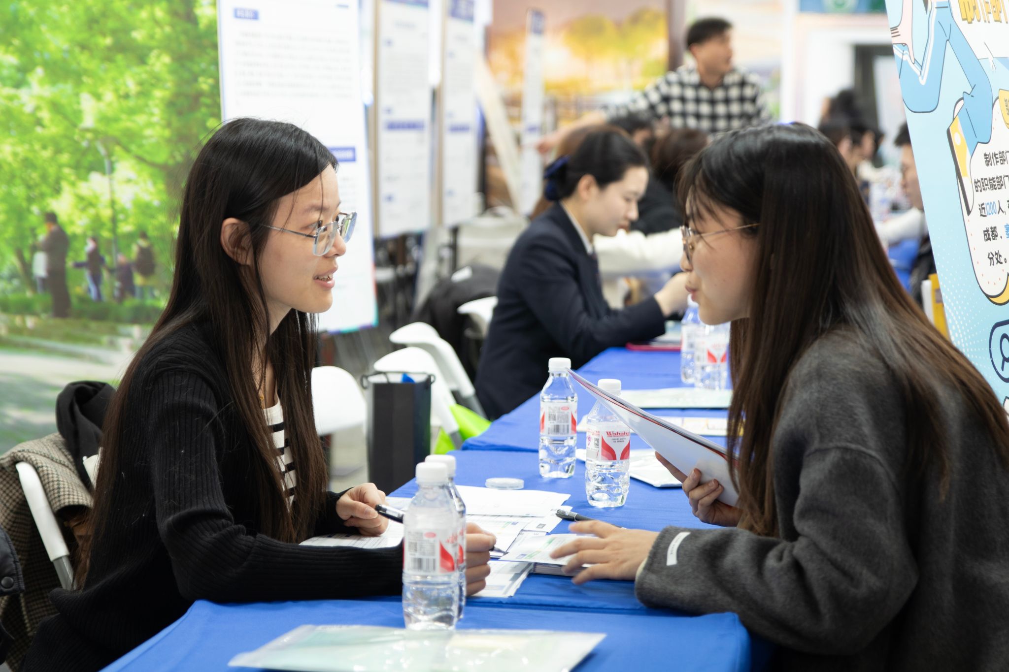 本次招聘会突破传统模式,创新打造了四大特色专区,筑起就业“赋能链”。“师友计划导师会客厅”有校内外企业导师联合坐镇,为同学们提供一对一生涯规划咨询;“‘一站式’职学服务区”整合考研、留学、考公三大路径资源,现场设置政策咨询与备考资料领取点;“AI智慧就业区”通过算法分析同学们的专业与兴趣,动态推送匹配岗位,并提供AI简历优化、AI模拟面试服务;“职业形象体验区”专业造型师驻场,为学生提供从妆容发型到商务礼仪的全流程指导。