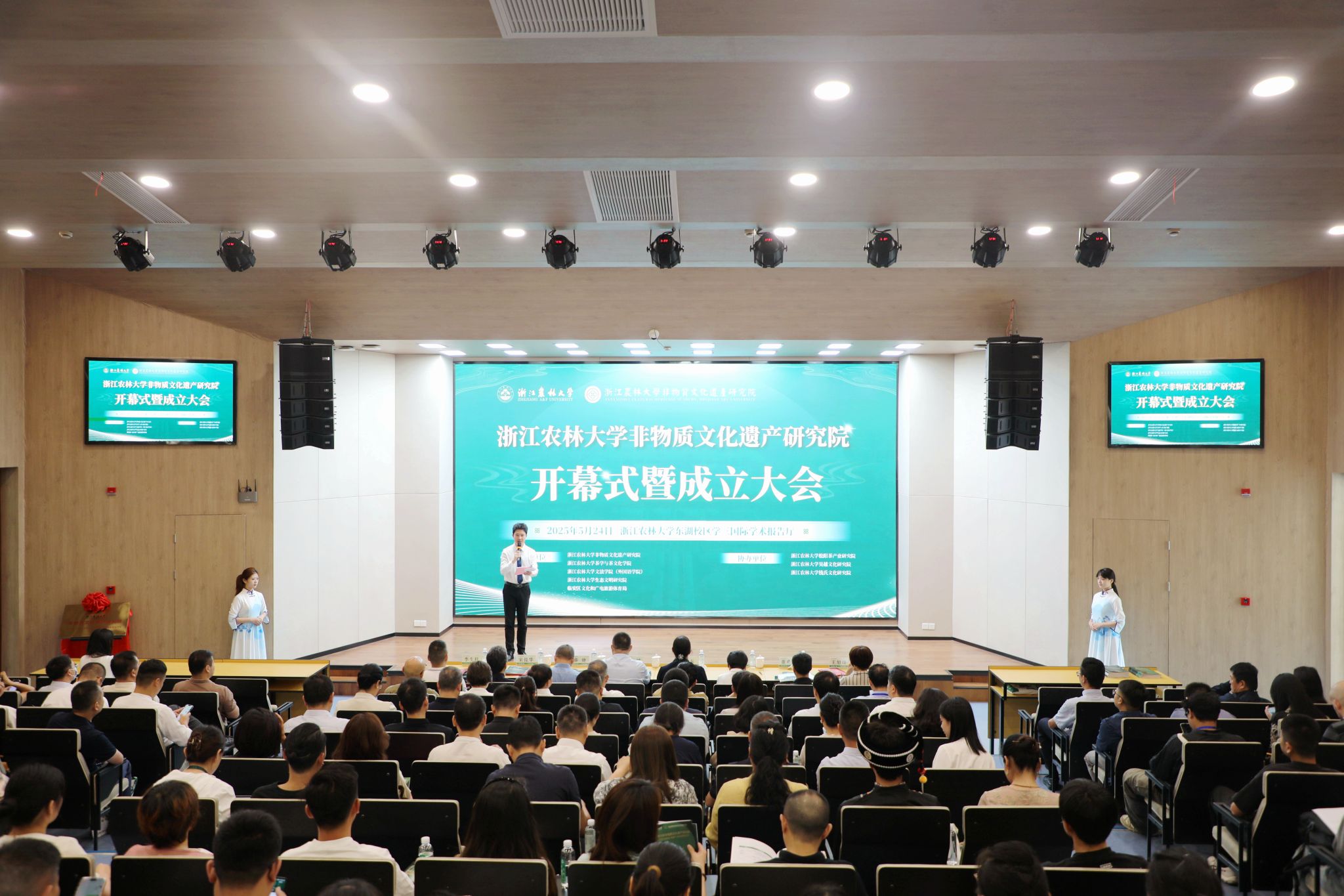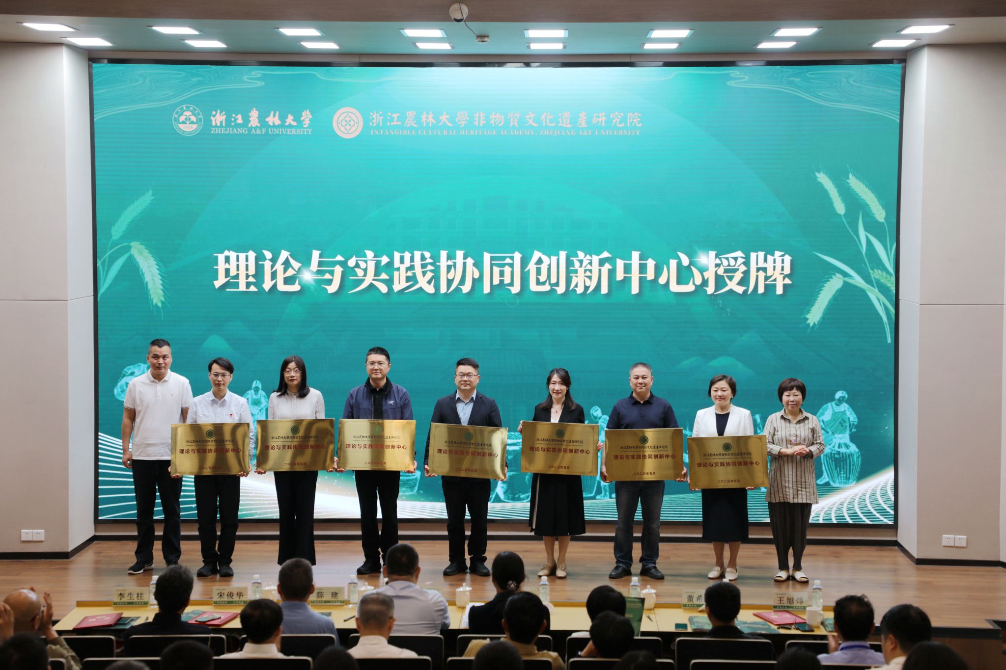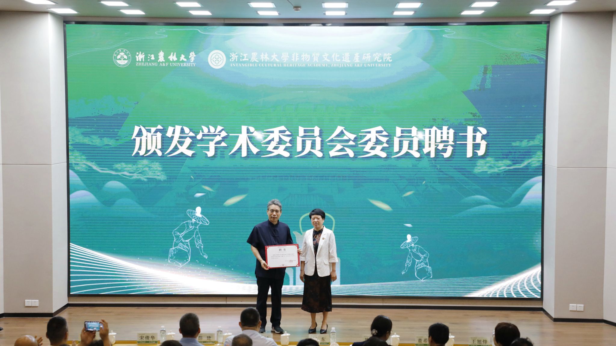 研究院还聘请了13位国内外知名非遗学术专家为学术委员会成员,特聘5位首席专家。同时,研究院还现场授牌成立与中国美术学院、安吉县文化和广电旅游体育局、临安区社会科学界联合会等多个机构共建的理论与实践协同创新中心,推进和加强非遗研究领域的高校互通与政企合作。