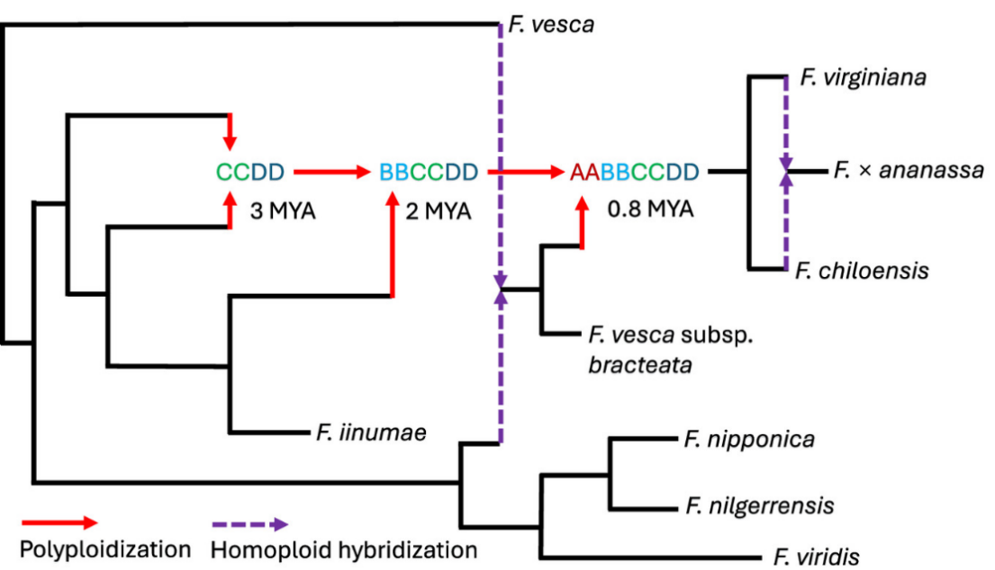 解析多倍体物种如栽培草莓(八倍体)的复杂进化史具有挑战性,这既源于潜在祖先物种的数量繁多,也因不同或相同倍性水平间可能存在杂交事件。本研究结合网状系统发育学与群体混合分析,阐明了八倍体草莓的起源,并发现其多倍化前,A亚基因组的祖先存在来自于其它二倍体物种的基因渗入。这为近年来围绕八倍体草莓的二倍体祖先物种鉴定所展开争论提供了新的解释。