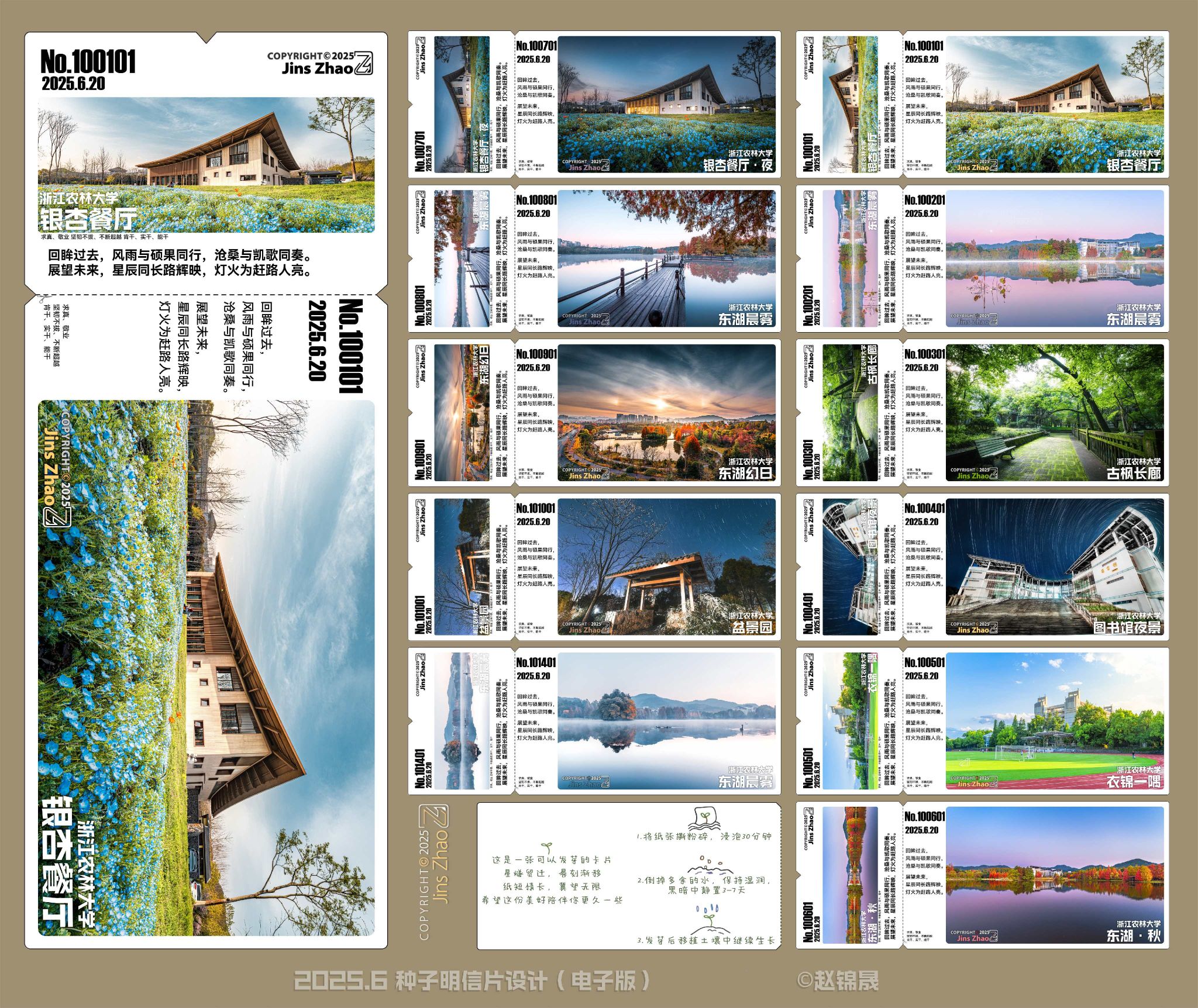 东湖氤氲的晨雾、图书馆上空梦幻的星轨、古枫长廊葱茏的绿意……明信片上的照片,经过赵锦晟的精挑细选,兼具地标性、特殊性、美观性,将校园的灵动展现得淋漓尽致。照片的背后是他与浙农林大的故事。