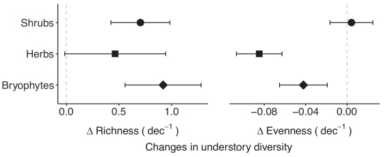 图.十年环境变化对不同种类林下植被丰富度、均匀度的影响