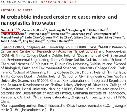 12月18日,暨阳学院李敦柱教授团队在《Science》子刊《Science Advances》(中科院1区Top,IF-5yr=14.1)在线发表题为“Microbubble-induced erosion releases micro- and nanoplastics into water”(《微气泡侵蚀塑料基材表面及其驱动微纳塑料释放机理研究》)的研究性论文并入选期刊官网封面。