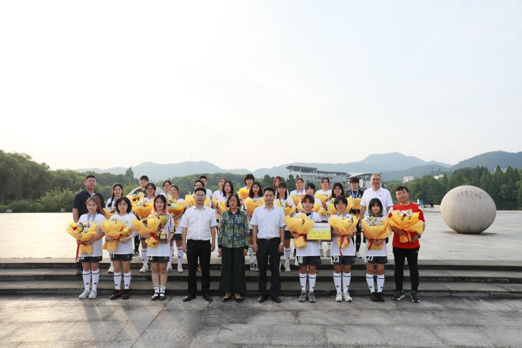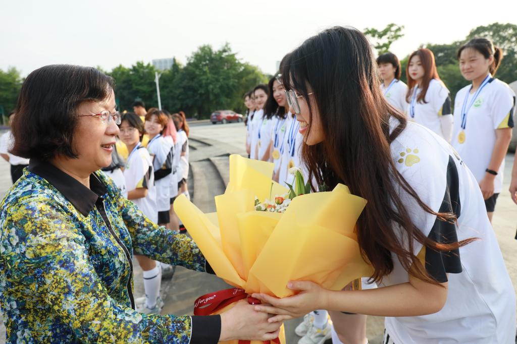 沈月琴把一束束鲜花送到了女足队员手中,褒奖队员们在此次比赛中取得的优异成绩,肯定她们一直以来不屈不挠的拼搏精神,感谢她们对学校发展做出的贡献。