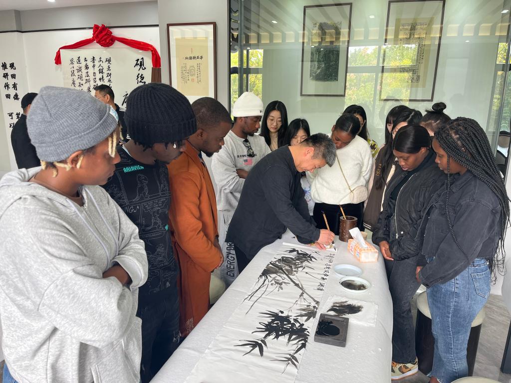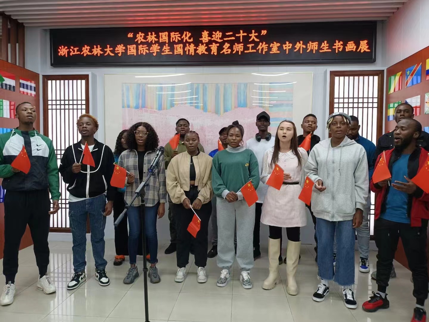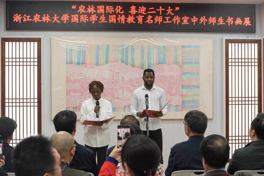 10月14日,国际学生国情教育名师工作室举办“农林国际化 喜迎党的二十大”中外师生书画展,让国际学生在沉浸式欣赏、学习和交流中感受中国书画文化的艺术魅力,厚植国际学生“知华友华、知浙友浙”情感,进一步提升广大国际生讲好中国故事、浙江故事的能力。