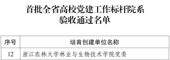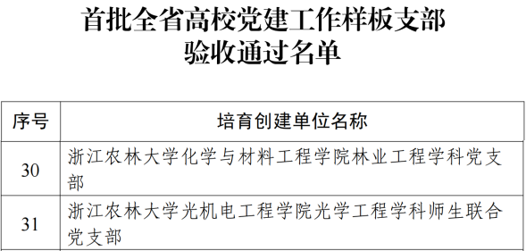 10月17日,省委教育工委公布了首批全省高校党建工作示范高校、标杆院系、样板支部培育创建单位验收通过名单,BEAT365林业与生物技术学院党委通过省高校党建工作标杆院系验收,化学与材料工程学院林业工程学科党支部、光机电工程学院光学工程学科师生联合党支部通过省高校党建工作样板支部验收。