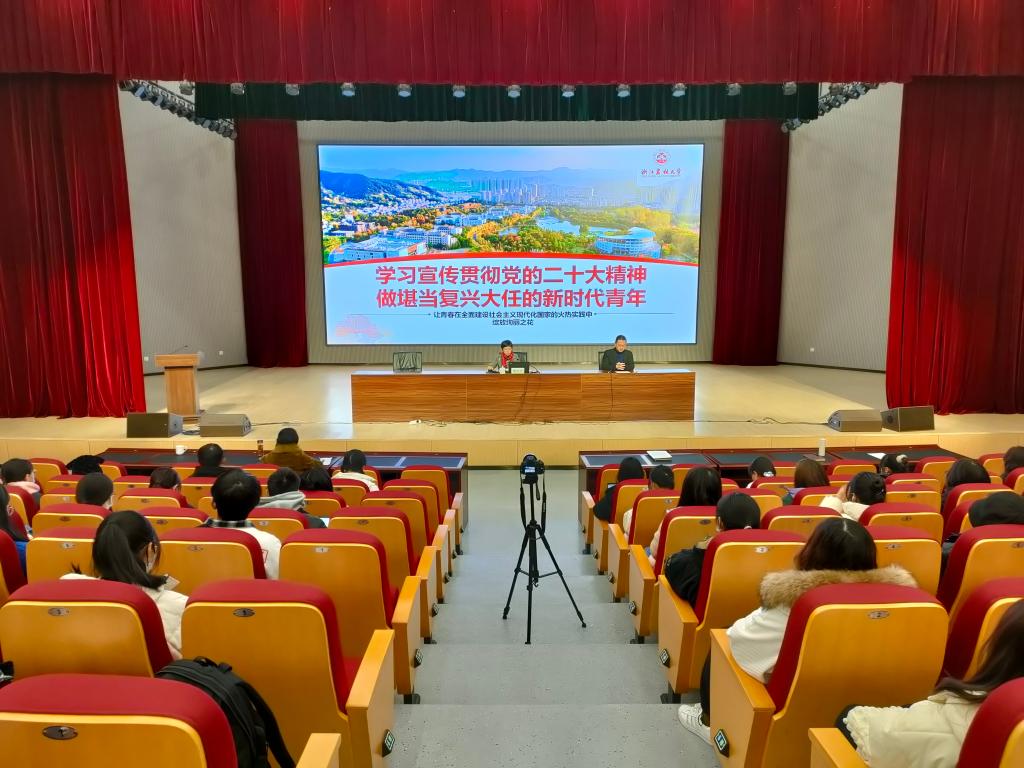施美红以《学习宣传贯彻党的二十大精神,做堪当复兴大任的新时代青年》为题,从党的二十大报告的主要内容、时代背景、历史方位、新时代的五大成就、未来宏伟蓝图五个方面带领大家一起系统地学习党的二十大精神。她同时结合学校实际,围绕乡村振兴、共同富裕、生态文明,学通弄懂做实,努力成为知农、爱农、强农、兴农的卓越农林人才,堪当复兴大任的新时代青年。施美红的报告高屋建瓴,内容丰富,为同学们学习贯彻党的二十大精神提供了科学指导。