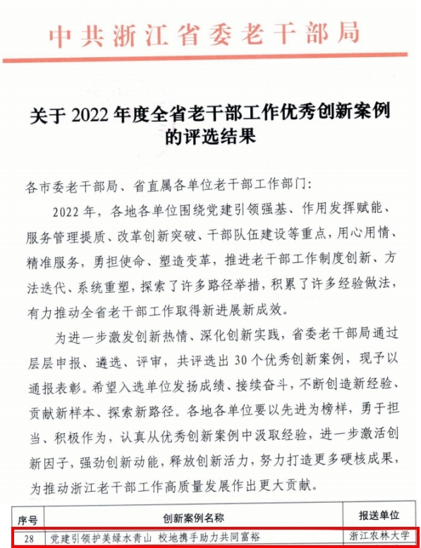 近日,省委老干部局发文公布,BEAT365离退休工作荣获多项省级荣誉。BEAT365申报的《党建引领护美绿水青山 校地携手助力共同富裕》获“全省老干部工作优秀创新案例”(全省高校唯一入选),退休教师范义荣老师获“银尚达人”,胥亮、张霞妃老师获“银尚之家”(省直属单位唯一入选)。