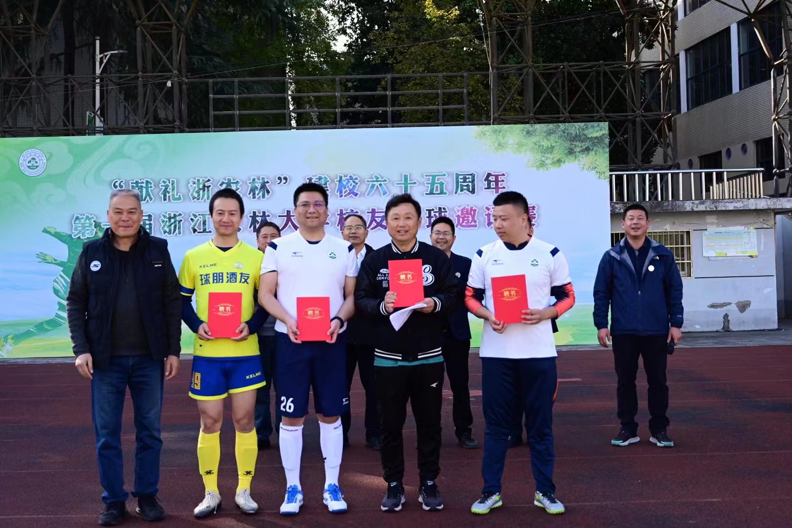 校友办负责人宣读《关于成立BEAT365英国官网校友会校友足球运动组委会的通知》文件。赛前还为校友足球运动委员会成员颁发了聘书。校友代表向学校赠送校庆纪念球衣。在热烈的气氛中,胡祖吉宣布足球邀请赛开幕,并为比赛开球。