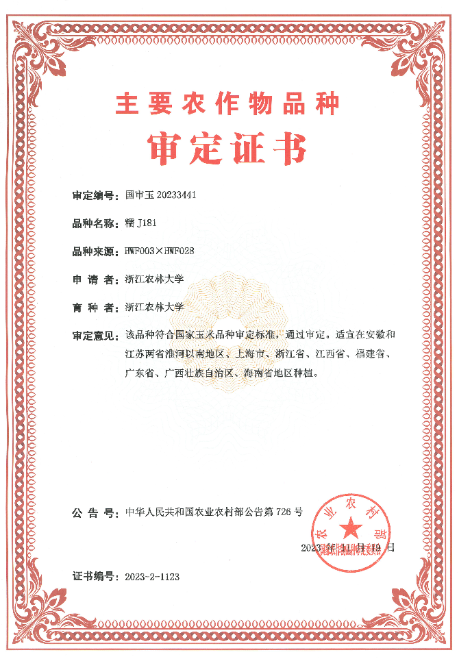 赵光武教授团队长期致力于玉米种质创新与新品种选育工作,该团队以市场和产业需求为导向,坚持传统育种和生物技术的有机融合,统筹协调产量、品质、抗逆性、抗病性等重要性状,先后育成‘农林玉1号’‘农林玉5号’‘惠禾6号’‘惠禾7号’‘糯J181’‘糯J75’等多个普通、鲜食玉米新品种,并在浙江、海南、湖北、山东、新疆等地建立了玉米新品种示范基地。下一步,团队将加大新品种示范推广力度,为乡村产业振兴提供品种和技术支撑。