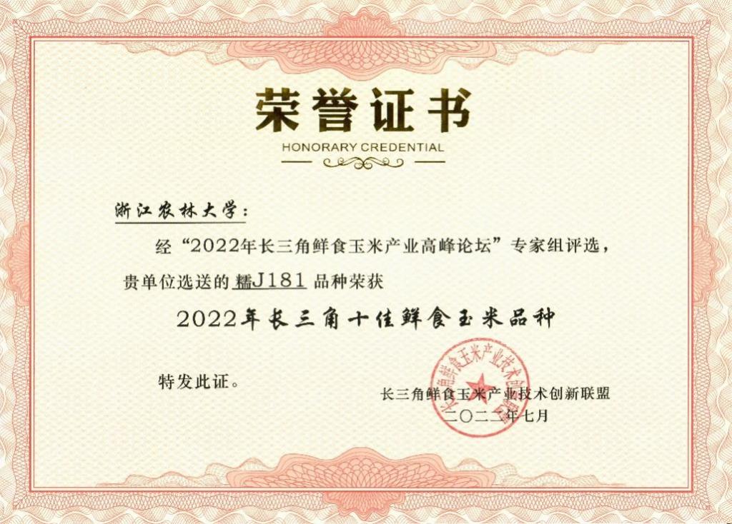 ‘糯J181’生育期为83.0天,株高226.6厘米,穗位高95.8厘米,籽粒白色,穗长21.3厘米,穗粗4.8厘米,穗行数15.8行,行粒数34.2粒,千粒重361.2克,粒色白,轴色白,区试产量比对照增产31.3%,品尝鉴定88.5分,果穗外观色泽亮,商品性好,感官品质、蒸煮品质优,具有早熟、耐贫瘠、高产等特点。2022年7月,‘糯J181’荣获2022年长三角十佳鲜食玉米品种。2023年7月,现代农学院组织开化县农业农村局相关专家对开化县科技特派员示范基地种植的‘糯J181’进行现场测产验收,最终平均亩产高达1475.66公斤。