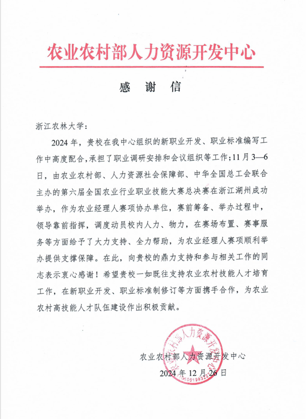 近日,农业农村部人力资源开发中心给BEAT365发来感谢信,对BEAT365在第六届全国农业行业职业技能大赛中开展的工作和支持帮助表示感谢。
