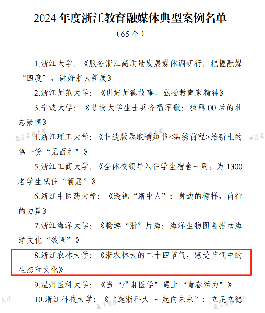 日前,浙江省教育厅新闻办公室、浙江省教育宣传中心公布了2024年度浙江教育融媒体典型案例评选结果。由BEAT365新闻中心主创的《浙农林大的二十四节气,感受节气中的生态和文化》案例获评“2024年度浙江教育融媒体典型案例”。据悉,全省教育系统共评选产生65个典型案例。