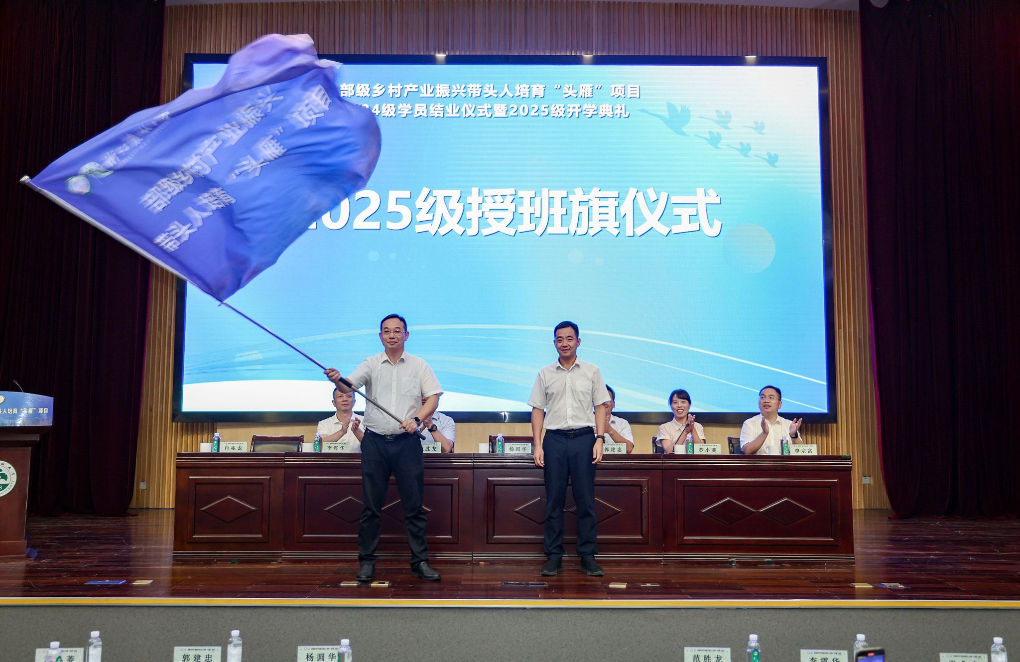 杨圆华代表学校向2024级结业学员表示祝贺,向2025级新学员表示欢迎。他对2024级结业学员提出三点希望:一是要永葆“农人”初心,把稳“头雁”航向;二是要善用资源纽带,振翅“头雁”领航,推动成果转化;三是要引领产业发展,彰显“头雁”担当,营造联农带农、兴农富农的良好氛围。他也对2025级新学员提出三点要求:一是要以“空杯心态”求真知、悟真谛;二是要以“开放姿态”结伙伴、汇众智;三是要以“先锋状态”谋突破、闯新路,发挥“带头致富、带领致富”作用。
