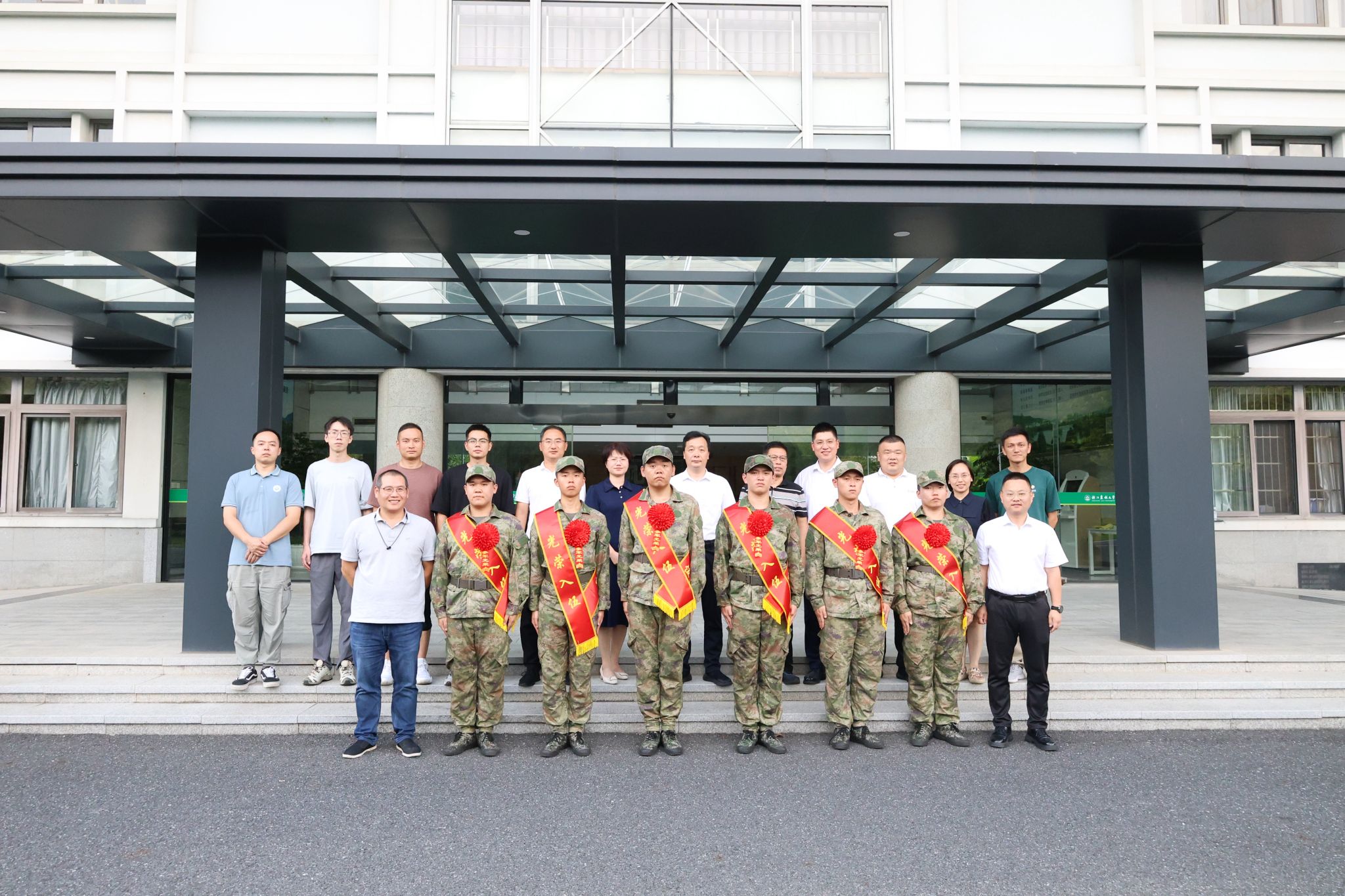 欢送会上,同学们身着戎装,肩披绶带,精神抖擞,整齐列队。倪建均为入伍同学佩戴红花、发放纪念品,并合影留念。
