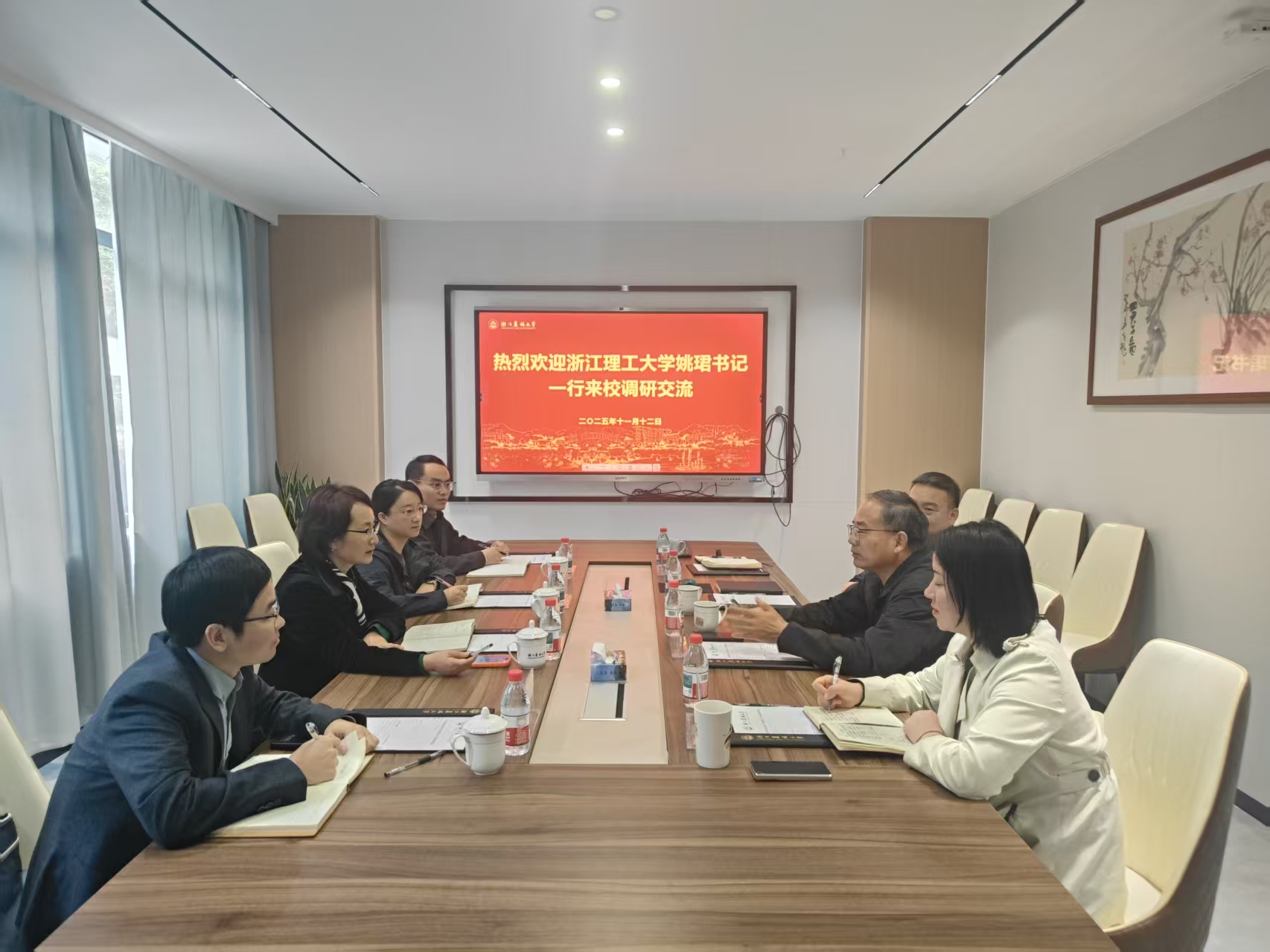 11月12日,浙江理工大学党委副书记姚珺一行来校调研。校党委副书记施美红在会前迎接并表示热烈欢迎。校友会常务副会长、校教育基金会副理事长胡祖吉出席并主持座谈会。
