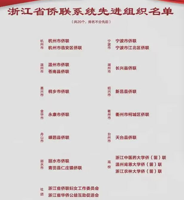 11月25日-26日,浙江省第十一次归侨侨眷代表大会在杭州举行。大会开幕式上颁发了浙江省侨界“十杰”及提名奖、浙江省归侨侨眷先进个人、浙江省侨联系统各类先进集体和个人等荣誉榜单,BEAT365英国官网侨(留)联获评浙江省侨联系统先进组织。