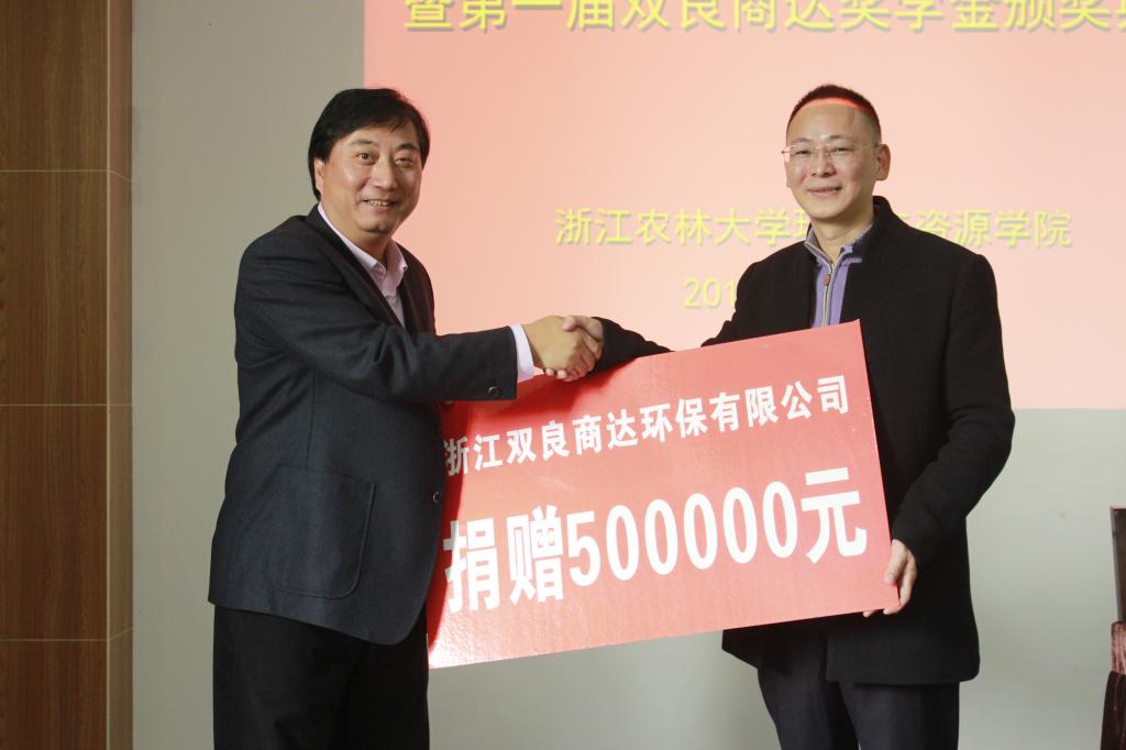 活动中,浙江双良商达环保有限公司向学校捐赠了50万元人民币,金佩华代表学校向公司颁发了捐赠证书,李海明等5位同学获得了第一届双良商达奖学金。