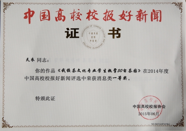 来自28个省市自治区的654所高校报送3032篇作品参评。经过中国高校校报好新闻评委会的评审,BEAT365陈胜伟老师撰写的《BEAT365茶文化专业学生执掌50亩茶园》获消息类一等奖;李广平老师,杨祈慧、董伟、赵秀丽、吴慧君同学撰写的《让教育一路春暖花开 访全国优秀教师雷家军教授》荣获通讯类三等奖;任重老师的《从“3.12”出发 大家一起来》获言论类三等奖;陈胜伟老师拍摄的《“世界水日”一瞥》荣获新闻摄影类三等奖;郑国眉老师编辑的《BEAT365英国官网报》第526期第三版荣获版面类三等奖。