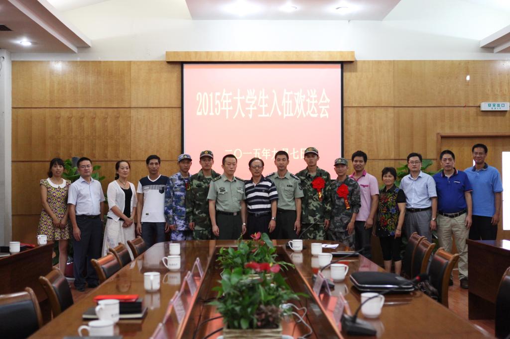 9月7日下午,2015年入伍学生欢送会在行政楼第一会议室隆重举行。校党委委员汪士华、临安市人武部副部长龚天健、宣传部、学工部、相关学院负责人和4名入伍学生及家长代表参加了本次欢送会。