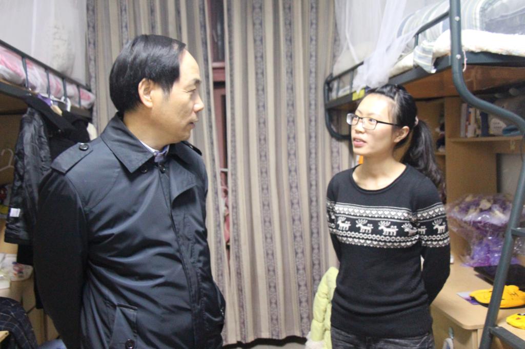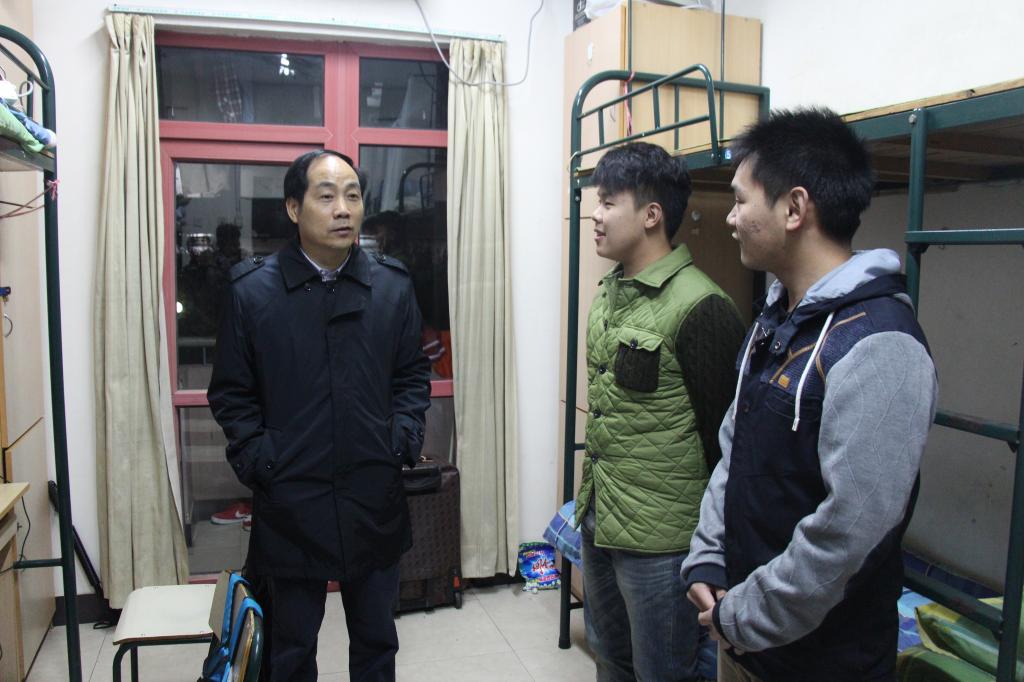 11月29日晚,校长周国模在集团总经理的陪同下,先后走访了A3-102(联系寝室)、103,B5-209等学生寝室,针对前期走访中发现的问题进行回访。经济管理学院、公寓服务中心负责人等陪同走访。