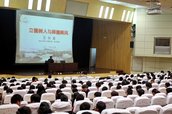 王长金从“立德树人”本意讲起,指出“立德”为古代学者所倡导的“立德”、“立功”、“立言”三立之首,在中国传统文化中是不朽的追求、事业之基、立身之本。强调“树人”须先立师德,首先,树立“不知为不知”的严谨治学态度、“敏以求之”的求实态度、“韦编三绝”的刻苦精神、“不耻下问”的好学品格;其次,崇尚“以身示教”的人格风范、“身正为范”的人格魅力、“因材施教”的教育理念;第三,提倡“清贫乐道”的敬业精神,对学生要有“有教无类”的公平精神,追求“忧道不忧贫”的人生哲学;最后,拥有“如琢如磨”的人文情怀。师生之间要建立“无隐无私”的民主作风、情同父子的师生关系,担负起教书育人的神圣使命。