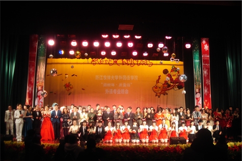 浙农林大新闻网讯 迎新年,庆圣诞。12月23日,外国语学院在活动中心影剧院举办2012年外语专业晚会。校党委副书记方伟,副校长张立钦,校党委委员、工会主席汪士华,校党委委员、科技处处长陈永富出席晚会。学校各职能部门负责人、各二级学院领导以及全校师生1200余人观看晚会。校领导、外国语学院领导班子与师生同台载歌载舞,掀起晚会阵阵热潮。