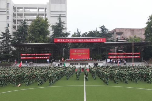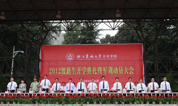 浙农林大新闻网讯 一年一度枫叶红,更是丹桂飘香时。9月5日上午,天目学院2012级新生开学典礼暨军训动员大会在衣锦校区田径场举行。校长周国模,校党委副书记余杰,副校长张立钦、鲍滨福,以及学生处处长缪鲁加、体军部党总支书记冯悦民、武警杭州士官学校上尉缪卫华、天目学院党政领导班子和学校有关职能部门负责人在主席台就坐。天目学院各系(部、中心)、各部门负责人,全体辅导员和2012级新生参加大会。大会由学院党委书记杨黎明主持。