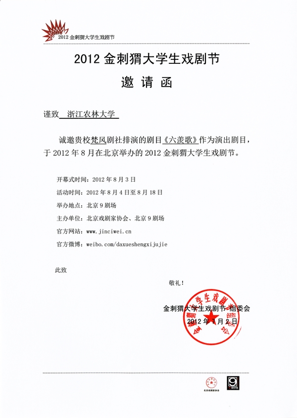 据悉,2012年金刺猬大学生戏剧节是全国第十一个大学生戏剧节,由北京戏剧家协会、北京9剧场联合主办,来自全国21个省市区的103所高校、121个大学生剧社的149部剧目报名参加。报名结束后,149部作品在网上进行了公示,接受网民投票,网络投票前5名作品直接入围,进京演出。余下的144部作品,由专家评委进行评分,评选出代表当今大学生精神面貌和理想的10多部剧目到京展演,并邀请2部特邀剧目,2部交流剧目进行演出。