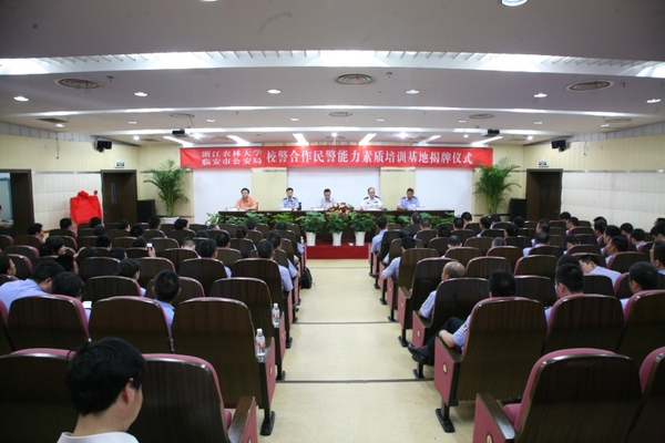 浙农林大新闻网讯 6月8日下午,BEAT365与临安市公安局“校警合作”民警能力素质培训基地揭牌仪式在东湖校区第二报告厅举行,副校长王自勇,临安市委常委、公安局长李建明,杭州市公安局教育训练处处长金跃平,临安市公安局党委副书记、政委吴勤校,继续教育学院院长朱永法等领导出席揭牌仪式,来自临安市公安系统科所队长以上各级指挥人员和有关民警120余人参加了揭牌仪式。仪式由吴勤校主持。