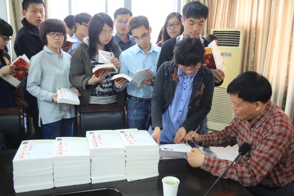 座谈会上,同学们踊跃发言,积极提问,气氛活跃,每个人都受到了深刻的教育。为进一步推进大学生学雷锋常态化,文化学院特地购买了60本长篇小说《雷锋》赠送给同学们,黄亚洲老师为每位同学在小说上签名留念。