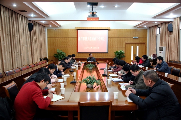 浙农林大新闻网讯 3月2日,学校召开2012年首次科研工作例会,部署年度科研工作。会议由副校长金佩华主持,各学院(部)分管科研工作负责人、科技处负责人参加了会议。