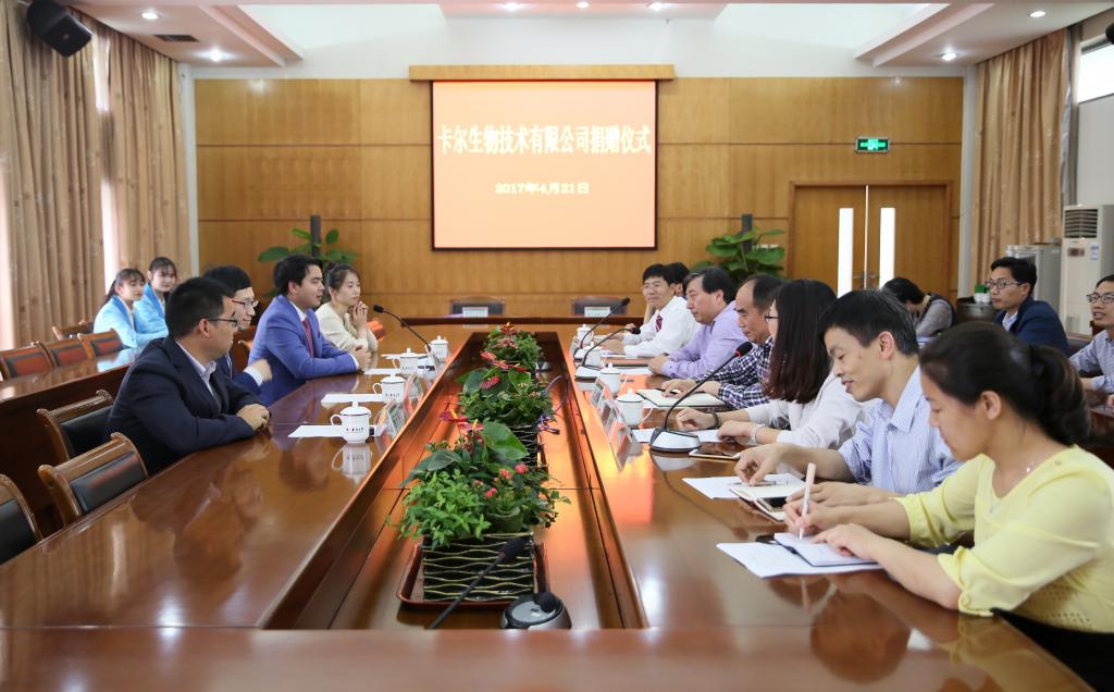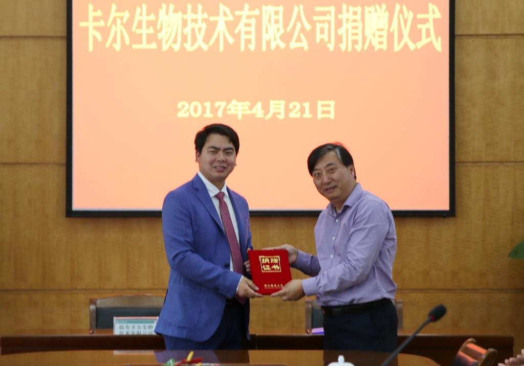 4月21日,临安卡尔生物技术有限公司捐赠仪式举行。副校长金佩华、临安卡尔生物技术有限公司董事长林高昂、校友办主任余剑耀、动物科技学院院长宋厚辉、党总支书记仲晓婷出席仪式,卡尔公司相关负责人和动科院师生代表参加仪式。