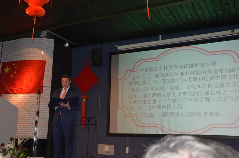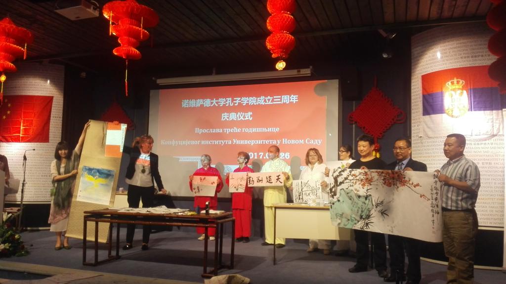 当地时间5月26日,塞尔维亚诺维萨德大学孔子学院举办建院三周年庆典活动。塞尔维亚伏伊伏丁那省副省长伊万·约克维奇(Ivan Djokovic)先生、伏伊伏丁那省高等教育和科学部副部长斯凡特拉娜·米海琪(Svetlana Mihic)女士、副校长金佩华、诺大孔院副校长斯讷苒娜·斯曼德兰娃琪(Snezana Smederevac)、中国驻塞使馆教育组孙新泉教授以及诺大孔院汉语教学点的校长等300多人参加了庆典。伏伊伏丁那省电视台等当地多家主流媒体进行了现场报道。